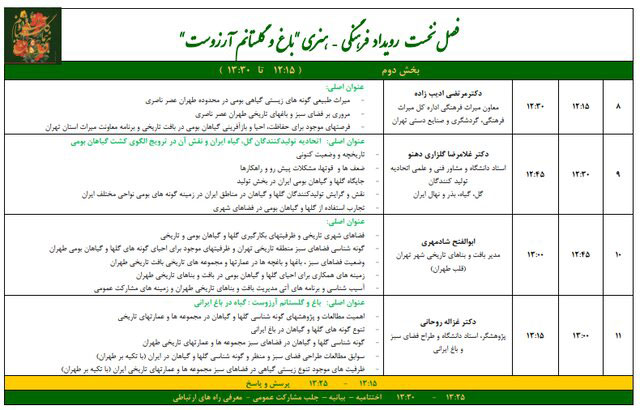 در ادامه، سعی بر آن خواهد بود تا آثار و داشتههای فرهنگی و هنری ایران، مورد توجه گیاهشناسان علمی قرار گیرد تا از این منظر، با بررسی ویژگیهای بومی گیاهان و با استفاده از تخصص مهندسان فضای سبز و طراح منظر مخصوصاً در حوزه باغسازی و باغآرایی، کاربرد این گلها و گیاهان که دارای پیشینه تاریخی و فرهنگی در ایران هستند، مورد مطالعه و بهکارگیری عملی در بافتها و عمارتهای تاریخی قرار بگیرد.