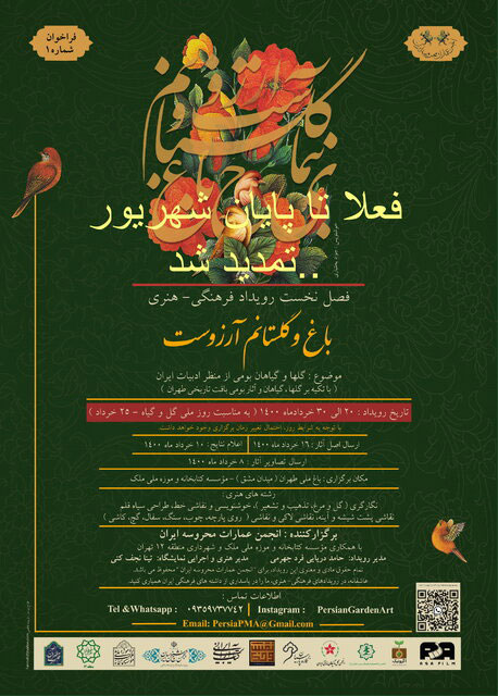 از آنجا که یکی از مهمترین منابع شناسایی گلها و گیاهان بومی، نوشتارهای مکتوب و در رأس آن ادبیات ایران است، لذا قصد آن داریم تا در بخش نمایشگاه هنری، با تکیه بر اشعار و ادبیات ایران، به خلق آثار هنری از گلها و گیاهان مناطق مختلف، در رشتههای هنری عنوانشده در پوستر بپردازیم.