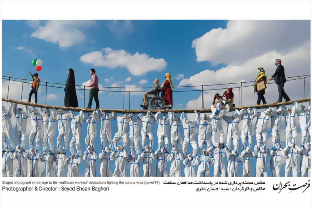 وی در مورد عوامل این عکس صحنه‌پردازی شده نیز گفت: در این کار حدود ۱۰۰ نفر عوامل تولید کار و ۵۳ نفر هنرور بودند. بازیگردانی توسط کوروش زارعی و طراح صحنه و لباس و کارگردانی توسط خودم انجام شد. دیگر عوامل این عکس عبارتند از: عکاس فنی: حسن کمالی، روتوش و کامپوزیت: ارسلان عیوض زاده، ساخت دکور: مجتبی علوی، مدیر تولید و دستیار کارگردان: مسعود مظفری، هماهنگی هنروران روی پل: سانا احمدی، گریم: مریم حسینی، تدوین: مسعود مظفری، تجهیزات: اسپلایسر استودیو، تجهیزات پزشکی: رضا رستگار (رهان طب) و با حمایت وزارت بهداشت، درمان و آموزش پزشکی (با همکاری خانه عکاسان ایران).