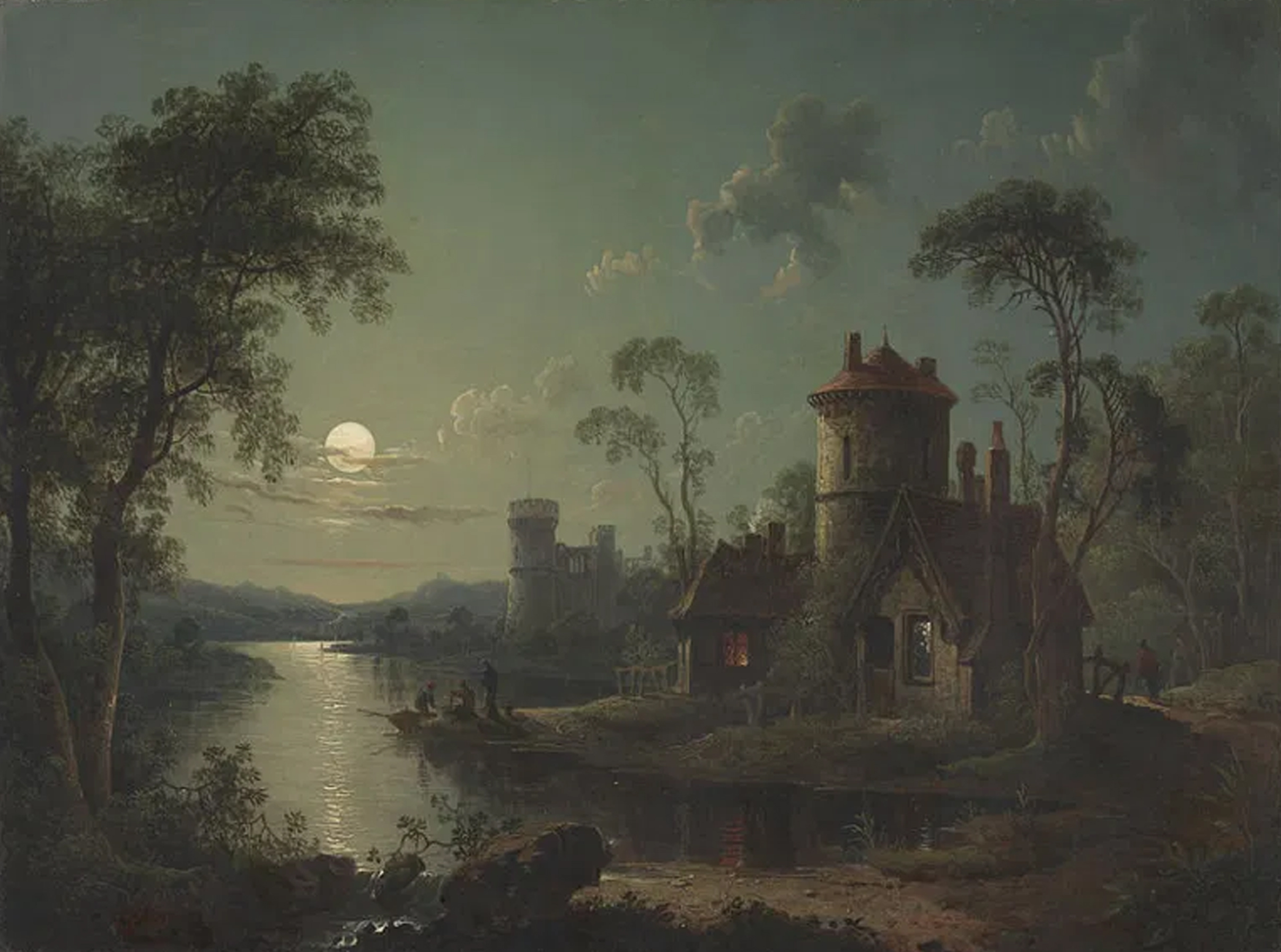تابلو دیگر اثری از سباستین پیتر، نقاش انگلیسی است. این نقاش آثار زیادی را درباره شب، غروب و طلوع کشیده است. در تابلو زیر که در سال ۱۸۴۰ ترسیم شده است، ترکیب هنرمندانهای از نور و تاریکی را میبینیم. به طوری که نور ماه باعث درخشش آب رودخانه شده و جلوه خاصی را به تصویر رودخانه و ماهیگیران بخشیده است. این نقاشی نیز متغلق به مکتب رئالیسم است. یعنی هر جزییاتی که در نقاشی دیده میشود در واقعیت وجود دارد.