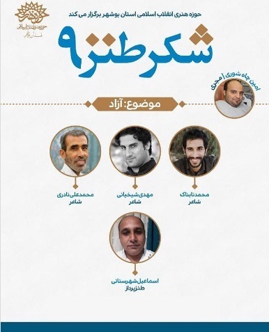 نهمین محفل طنز شکرطنز به صورت مجازی به همت حوزه هنری استان بوشهر برگزار شد. در این محل شاعران و طنزپردازان بوشهر تازهترین آثار خود را برای علاقهمندان به طنز و ادبیات خواندند. برای دیدن این برنامه میتوانید به صفحه اینستاگرام حوزه هنری استان بوشهر مراجعه کنید.