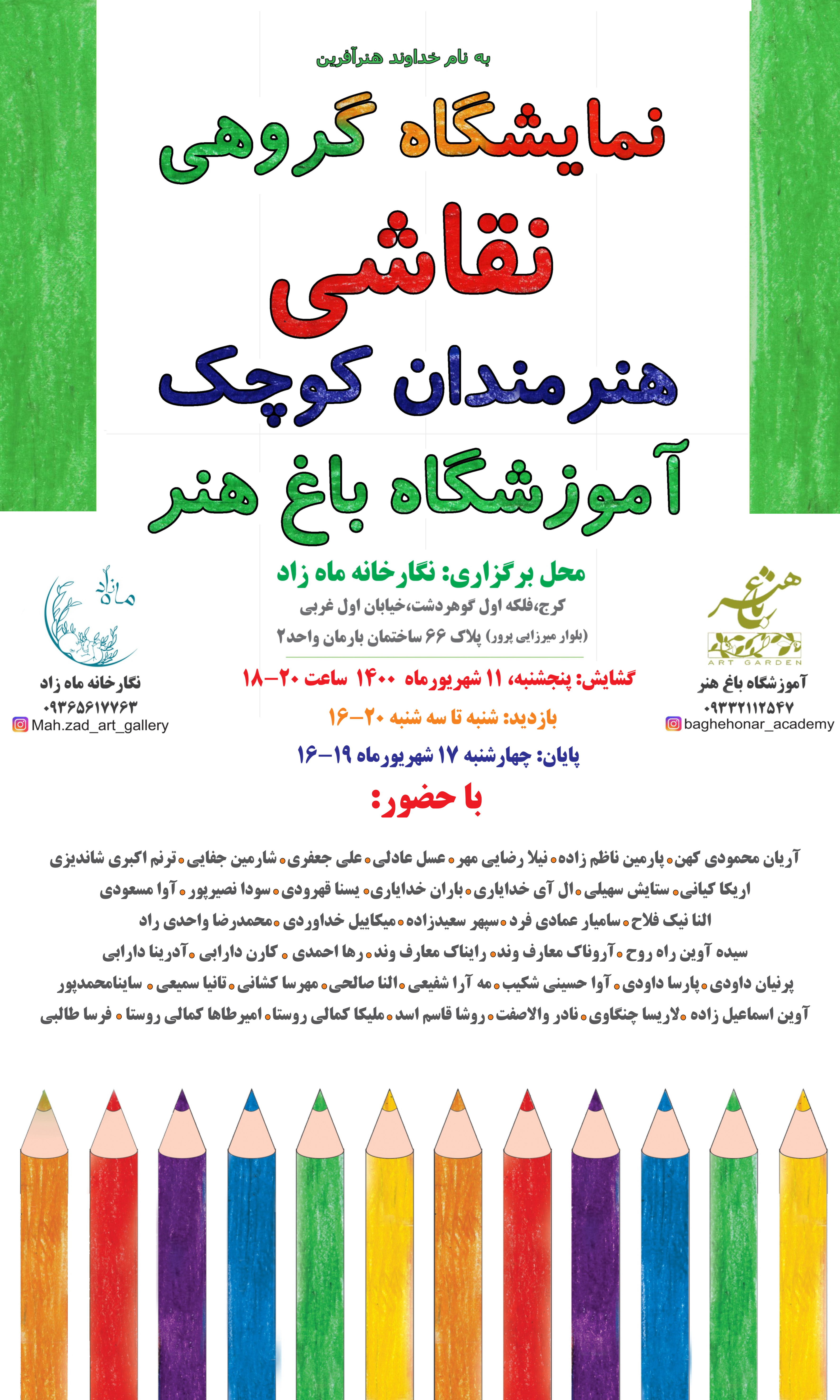 به گزارش روابط عمومی مرکز تجسمی حوزه هنری، نگارخانه ماهزاد در کرج، از پنجشنبه ۱۱ شهریور ۱۴۰۰ ساعت ۱۸ میزبان هنرمندان کوچک آموزشگاه باغ هنر میباشد.