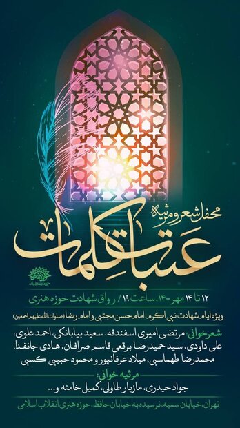 لازم به ذکر است محفل شعر و مرثیه « عتبات کلمات» از ۱۲ تا ۱۴ مهرماه ساعت ۱۹ در رواق شهدای حوزه هنری واقع در خیابان سمیه نرسیده به خیابان حافظ برگزار می‌شود.