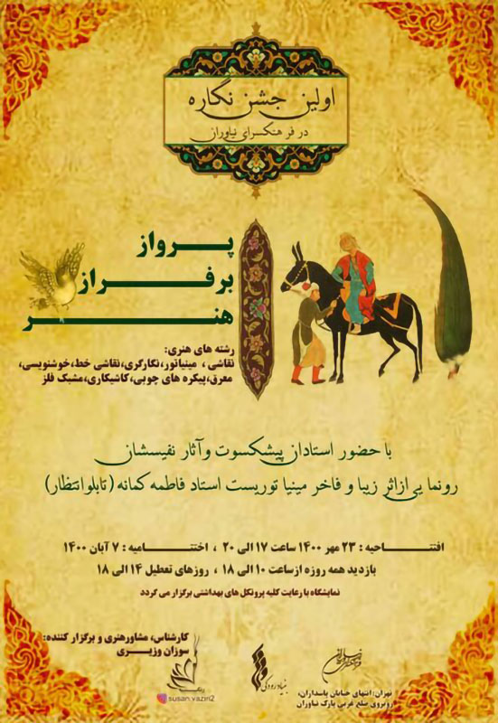 نمایشگاه گروهی «جشن نگاره» از ۲۳ مهر تا هفتم آبان ماه در گالری شماره یک فرهنگسرای نیاوران برپاست و علاقهمندان میتوانند برای بازدید از این نمایشگاه در روزهای عادی از ساعت ۱۰ تا ۱۸ و در روزهای تعطیل از ساعت ۱۴ تا ۱۸ به فرهنگسرای نیاوران مراجعه کنند.