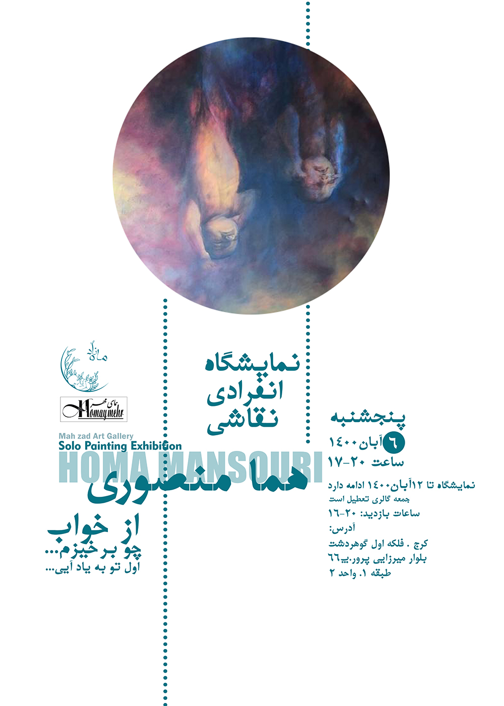 به گزارش روابط عمومی مرکز تجسمی حوزه هنری، نمایشگاهی از آثار هما منصوری با عنوان " از خواب چو برخیزم , اول تو به یاد آیی" در گالری ماه زادِ کرج گشایش می یابد.