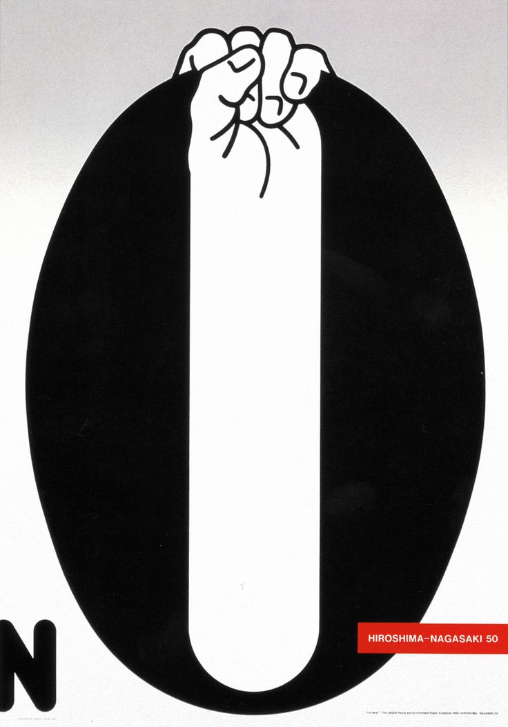 این پوستر جهت پنجاهمین بزرگداشن ناگازاکی ژاپن طراحی شده است. ناگازاگی، شهری ساحلی در جنوب غربی هیروشیمای ژاپن است که در اگوست 1945 طی جنگ جهانی دوم توسط آمریکا بمباران هسته ای شد. دستی مشت شده عدد صفری را گرفته و آن را می فشارد. مجموع پنج انگشت و عدد صفر بیانگر عدد پنجاه هستند که به پنجاهمین بزرگداشت ناگازاکی اشاره دارند. عدد صفر و فضای منفی آن به کمک خطای دید فرم دست را ایجاد کرده اند. حرف اول کلمه ناگازاکی به صورت حرف N در گوشه سمت چپ پوستر قرار گرفته است.