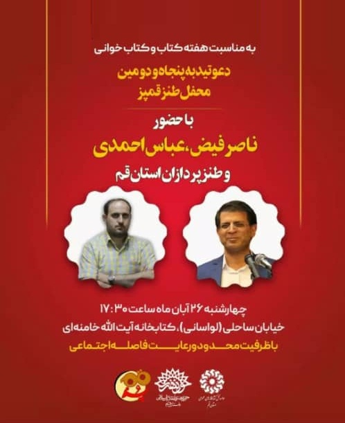 قمپز پنجاه و دوم با ظرفیت محدود، رعایت فاصل اجتماعی و پروتکل‌های بهداشتی به مناسبت هفته کتاب و کتاب‌خوانی و به همت دفتر طنز حوزه هنری استان قم برگزار می‌شود.