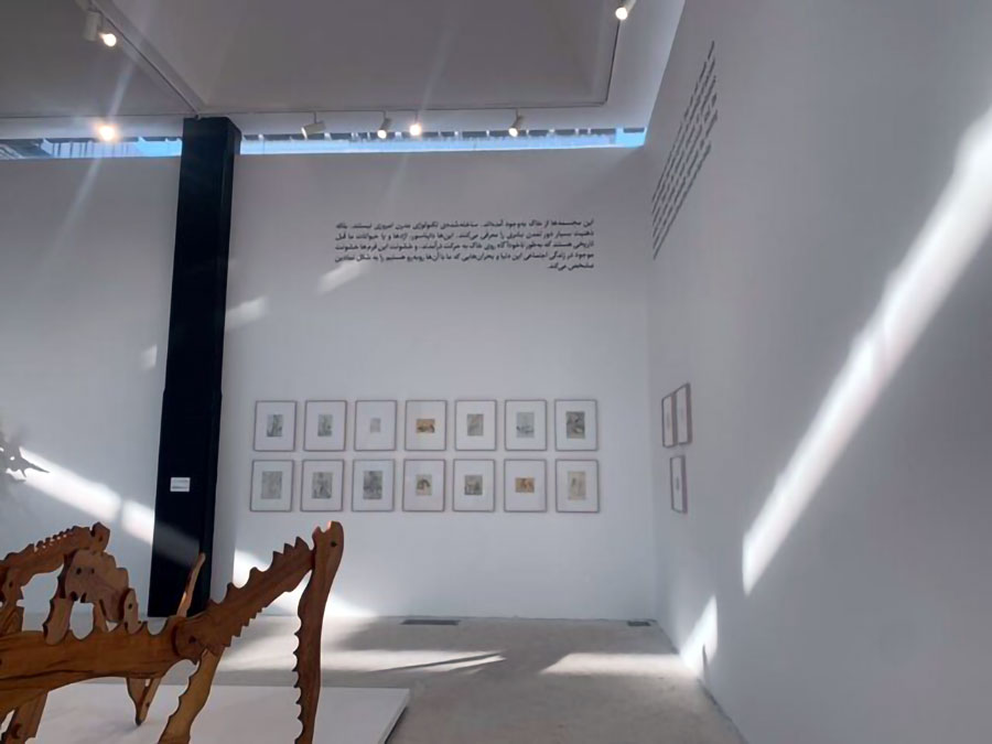 در طبقه دوم و در گوشه سمت راست دیوار، با خطی درشت چنین نوشته شده است: «این مجسمهها از خاک به وجود آمدهاند. ساخته شدهی تکنولوژی مدرن امروزی نیستند، بلکه ذهنیت بسیار دور تمدن بشری را معرفی میکنند. اینها دایناسور، اژدها و یا حیوانات ما قبل تاریخی هستند که بهطور ناخودآگاه روی خاک به حرکت درآمدند. خشونت این فرمها خشونت موجود در زندگی اجتماعی این دنیا و بحرانهایی که ما با آنها روبهرو هستیم را به شکل نمادین مشخص میکند.»