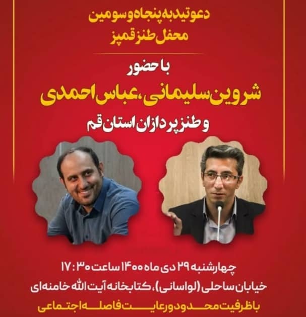به گزارش روابط عمومی دفتر طنز حوزه هنری پنجاه و سومین محفل طنز قمپز چهارشنبه 29 دیماه 1400 ساعت 17:30 برگزار میشود.