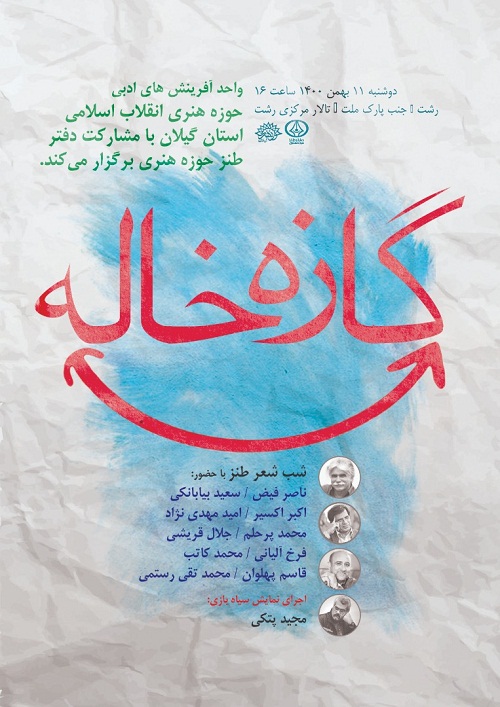 شب شعر طنز گازه‌خاله به همت دفتر آفرینش‌های ادبی حوزه هنری استان گیلان و دفتر طنز حوزه هنری برگزار می‌شود