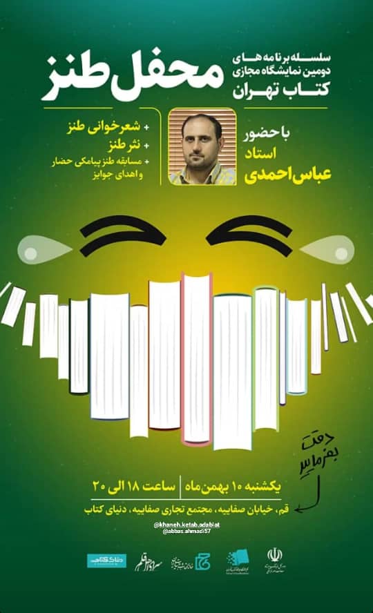 به گزارش روابط عمومی دفتر طنز حوزه هنری محفل طنز با حضور دکتر عباس احمدی برگزار میشود. این محفل در قالب سلسله نشستهای دومین نمایشگاه مجازی کتاب تهران یکشنبه دهم بهمنماه 1400 ساعت 18 برگزار خواهد شد.