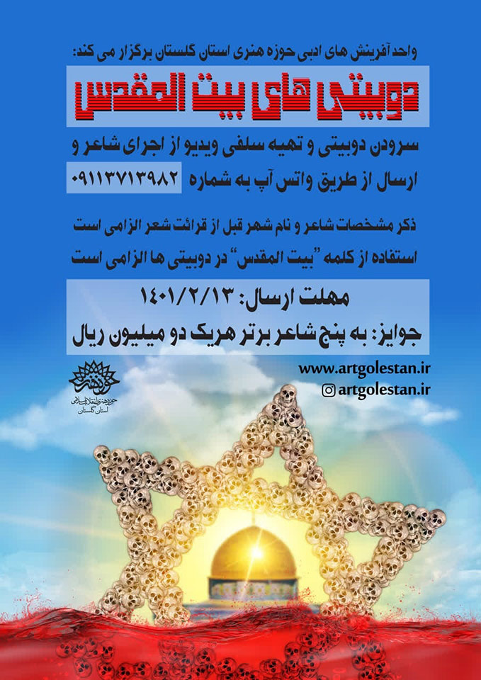 به گزارش روابط عمومی حوزه هنری انقلاب اسلامی استان گلستان،مسئول واحد آفرینشهای ادبی این مرکز درباره خبر فوق گفت: علاقمندان به شرکت در این مسابقه می توانند با سرودن دوبیتی ، تهیه ویدئواز اجرای شاعر و ارسال آن به شماره واتس آپ 09113713982 در این مسابقه شرکت کنند.