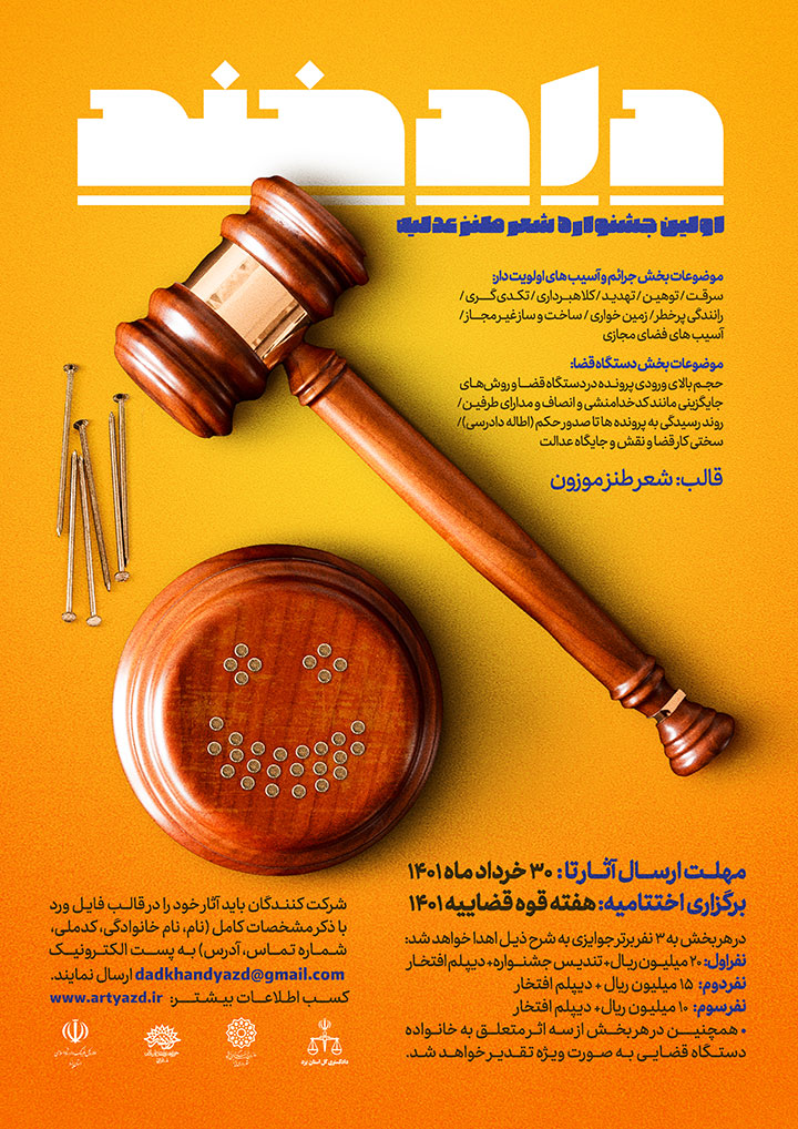 به گزارش روابط عمومی حوزه هنری استان یزد، سرپرست حوزه هنری یزد گفت: اولین جشنواره شعر طنز قوه قضاییه در استان یزد با عنوان «دادخند» به همت دادگستری کل استان یزد و با همکاری حوزه هنری یزد، اداره کل فرهنگ و ارشاد اسلامی استان و سازمان فرهنگی، اجتماعی و ورزشی شهرداری یزد در هفته قوه قضاییه به میزبانی شهر میراث جهانی یزد برگزار میشود.