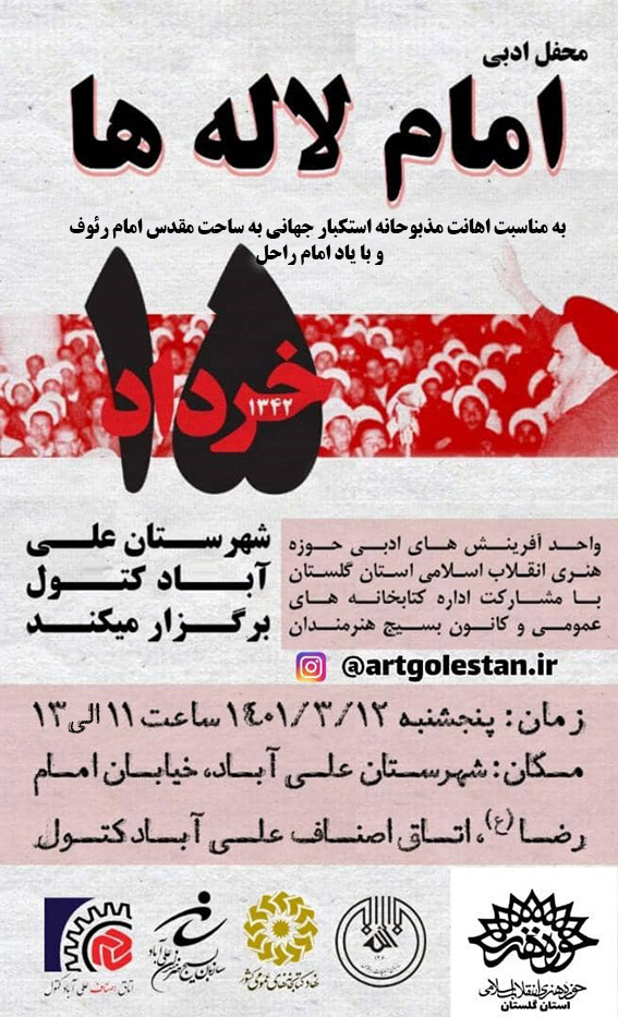 حسین عبدی در ادامه از کلیه علاقمندان به حضور در این همایش دعوت کرد و اظهار داشت: همایش شعر "امام لاله ها"توسط حوزه هنری انقلاب اسلامی و با همکاری اداره کل تبلیغات اسلامی،اتاق اصناف،بسیج هنرمندان و اداره کتابخانه های شهرستان علی آباد کتول برگزار میشود.