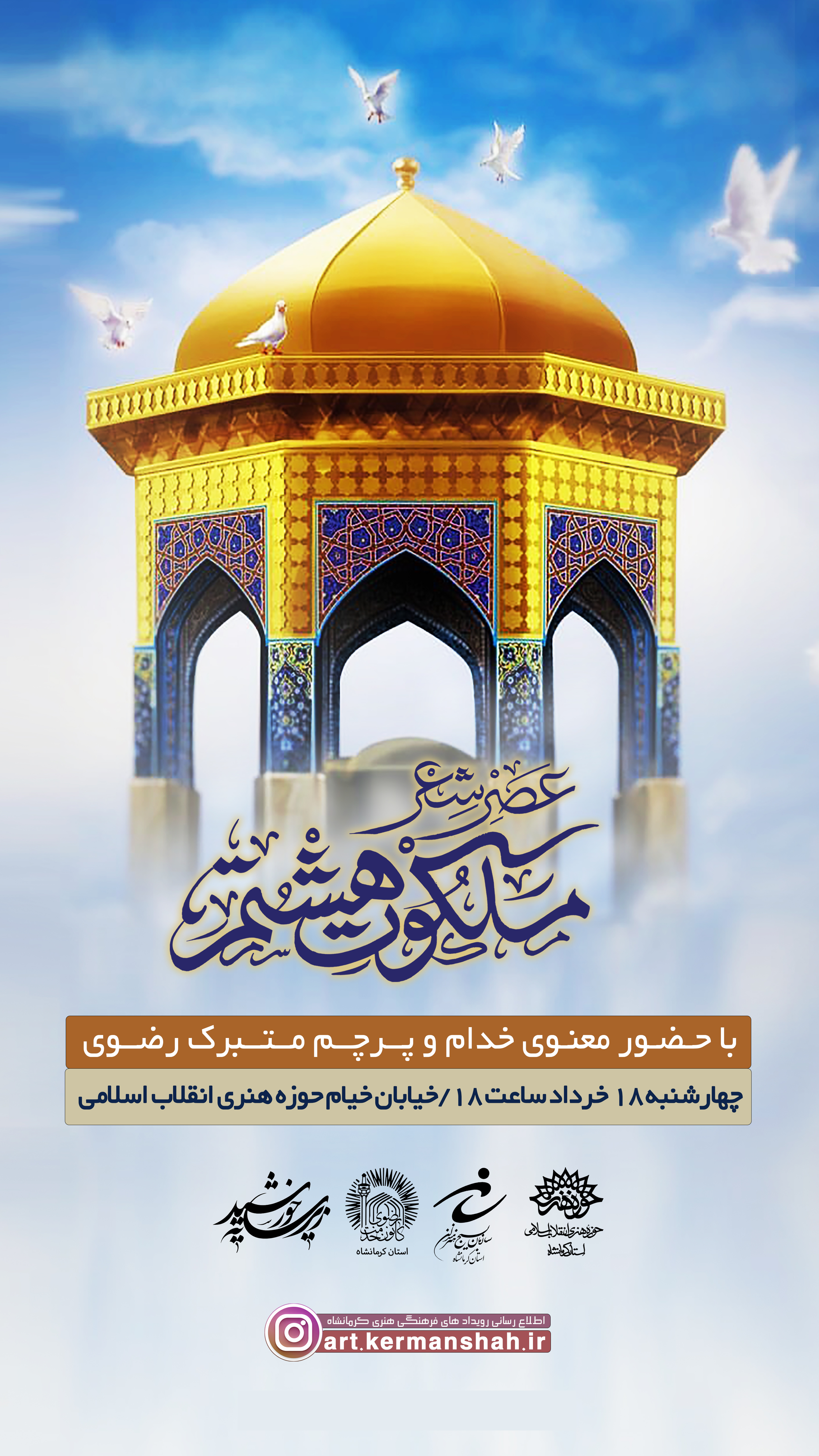 محفل ادبی "عصر شعر ملکوت هشتم" با محوریت شعرخوانی در مدح حضرت علی بن موسی‌الرضا (ع) با حضور خدام رضوی، عصر چهارشنبه 18 خردادماه 1401 به میزبانی حوزه هنری انقلاب اسلامی استان کرمانشاه، برگزار می‌شود.