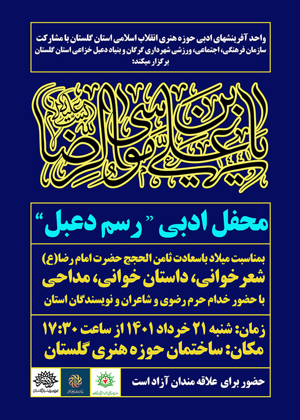 به گزارش روابط عمومی حوزه هنری انقلاب اسلامی استان گلستان ،مسئول واحد آفرینشهای ادبی این مرکز درباره خبر توضیح بیشتری داد و گفت: این محفل ادبیتوسط حوزه هنری و با مشارکت سازمان فرهنگی،اجتماعی شهرداری گرگان و بنیاد دعبل خزاعی استان گلستان برنامه ریزی شده است و هنرمندان شاعر و نویسنده در این نشست ادبی به شعرخوانی وداستان خوانی با موضوع امام رئوف خواهند پرداخت.