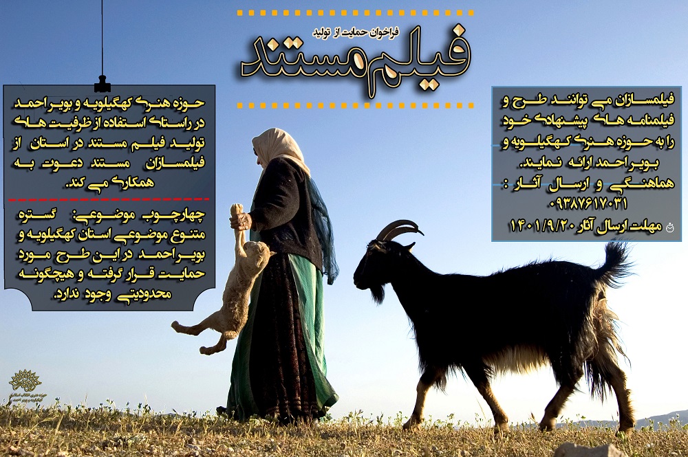 به گزارش روابط عمومی حوزه هنری کهگیلویه وبویراحمد؛ محمد حسن محمودی مسئول واحد هنرهای تصویری حوزه هنری استان گفت : حوزه هنری کهگیلویه وبویراحمد در راستای استفاده از ظرفیت های تولید فیلم مستند با انتشار این فراخوان حمایتی از فیلمسازان مستند دعوت به همکاری می کند.