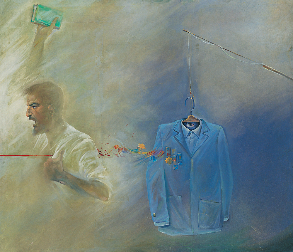 دوست دارم که در این جریان به یک نمونه و خاطره تعریف کنم. وقتی حضرت آیتالله خامنهای، رئیس جمهور بودند میخواستند برای یک بازدید به حوزه هنری بیایند. تابلویی داشتم به نام "هرگز مباد" که مردی ایستاده با قرآن در دست و گلولهای در سینه که قطرات خونش درجه و مدال شده است و به سینه فرد دیگری چسبیده است، نشان میداد. خیلیها در آن زمان اصرار داشتند که این کار خیلی تلخ و تند است و نباید به ایشان نشانش بدهیم. من همانجا گفتم که اگر قرار است این کار از نمایشگاه برداشته شود من از حوزه میروم و آثارم را هم میبرم. چرا باید من هنرمند مصلح و دلسوز حرفم را نزنم و منتظر باشم که BBC و VOA آنچه که میخواهند دیکته کنند؟ و با این صحبتها نگذاشتم که تابلوی "هرگز مباد" از روی دیوار پایین آورده شود. حضرت آقا به نمایشگاه آمدند و بازدید کردند. گروهی از مدیران حوزه آن موقع مدام میخواستند کاری کنند که این تابلو دیده نشود ولی ایشان اثر من را دیدند. به نام مرا صدا کردند و گفتند که این چیست؟ گفتم آقا شما هنرمندید و به نشانهشناسی وارد هستید و از من هم قویتر هستید. لطفا خودتان در مورد اثر من قضاوت کنید.
