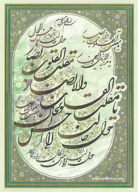 وی در پایان درباره این موضوع که این روزها به عنوان خوشنویس به جز تدریس و تالیف آثار آموزشی و هنری که سال هاست به آن اشتغال دارد مشغول چه فعالیتی است و آیا تصمیم به برگزاری نمایشگاه دارد یا نه، بیان کرد: خوشبختانه ماه گذشته به همت وتلاش شخصی خودم و همیاری استاد محمد حیدری که از استادان پیشکسوت شکسته نویس معاصر است، به دنبال فراخوانی که برای همه شکسته نویس ها داشتیم نمایشگاهی با عنوان «سماع شکسته» در برج میلاد برپا کردیم که بی گمان بزرگترین نمایشگاه دوران معاصر بود که با شرکت ۱۴۱ تن از هنر مندان و استادان این قلم بر پا شد و نمایش با شکوهی از دستاورد خلاقه شکسته نویسی معاصر بود و تصمیم داریم این رویداد را به صورت تقویمی برگزار کنیم، اما باید بگویم این تلاش ملی مثل همه برنامه ها از هیچ حمایت مالی دولتی برخوردار نبود. بی مزد بود و منت هر خدمتی که کردم/ یا رب مباد کس را مخدوم بی عنایت.