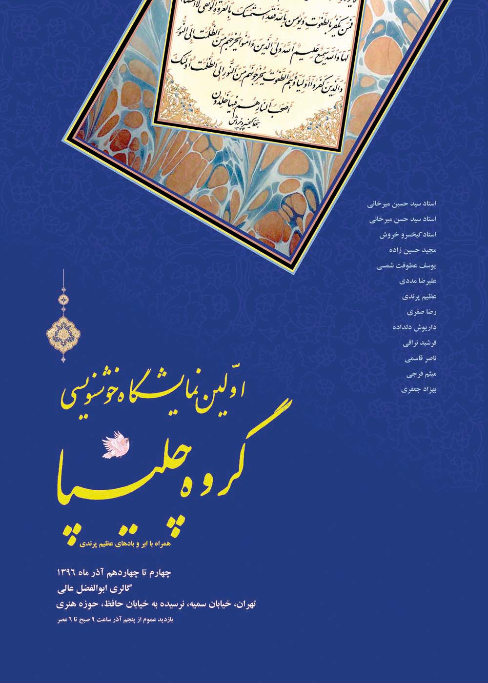 نمایشگاه خوشنویسی گروه چلیپا روز شنبه چهرم آذرماه از ساعت 16 در گالری عالی حوزه هنری، واقع در خیابان سمیه، نرسیده به خیابان حافظ برگزار خواهد شد.