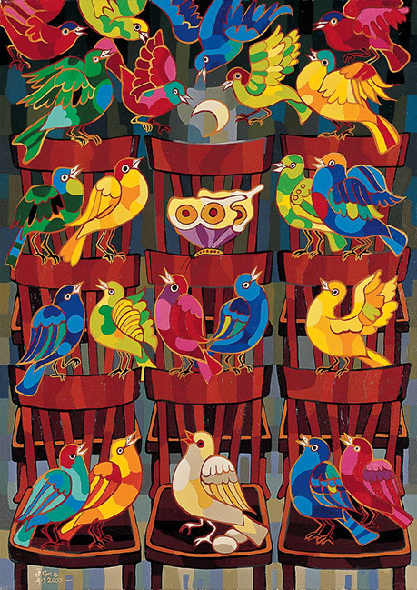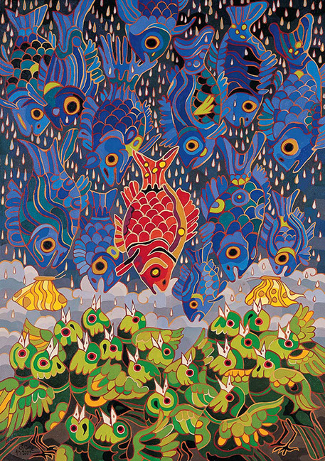 دنیای آثار او دنیایی فیگوراتیو است که به نقاشی های مینیاتور قدیمی با اشکال مردمی تر هنر شباهت دارند.
