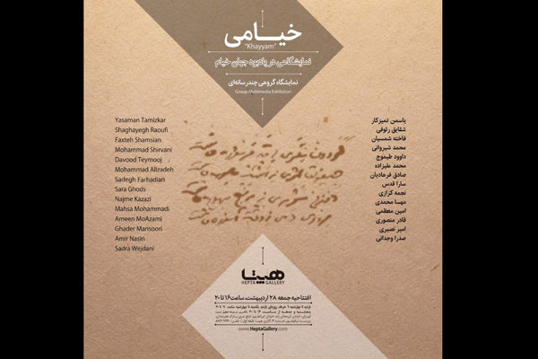 به گزارش روابط عمومی مرکز تجسمی حوزه هنری، جمعه ۲۸ اردیبهشت نمایشگاه «خیامی» در گالری هپتا افتتاح خواهد شد که این نمایشگاه درباره جهان خیام از دید هنرمندان معاصر است.