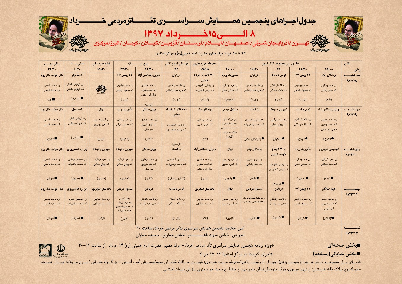 بر اساس این گزارش، جدول اجراهای آثار پنجمین همایش سراسری تئاتر مردمی خرداد به شرح زیر اعلام می شود: