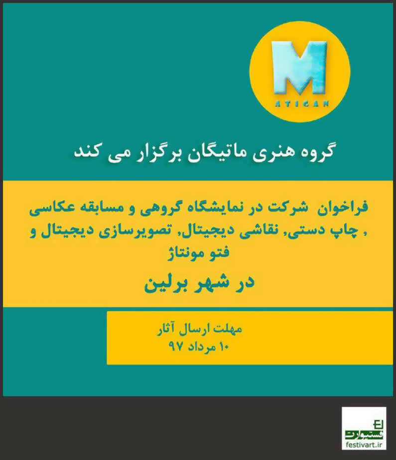 ■ گروه هنری ماتیگان اقدام به برگزاری نمایشگاه عکاسی، چاپ دستی، نقاشی دیجیتال، تصویرسازی دیجیتال و فتومونتاژ در شهر برلین آلمان با موضوع آزاد نموده است. این نمایشگاه در شهریور ماه سال ۱۳۹۷ به مدت ۷ روز در گالری ماتیگان با همکاری مرکز فرهنگی برلین برگزار خواهد شد.محل برگزاری نمایشگاه در فضایی بسیار زیبا و وسیع در مرکز شهر برلین، با امکانات نورپردازی مدرن خواهد بود. شایان ذکر است از آنجاییکه امکان حضور بسیاری از هنرمندان از سراسر دنیا در این نمایشگاه فراهم میگردد، لذا فرصتی استثنایی جهت معرفی آثار هنرمندان کوشای ایران زمین در کل جهان خواهد بود.