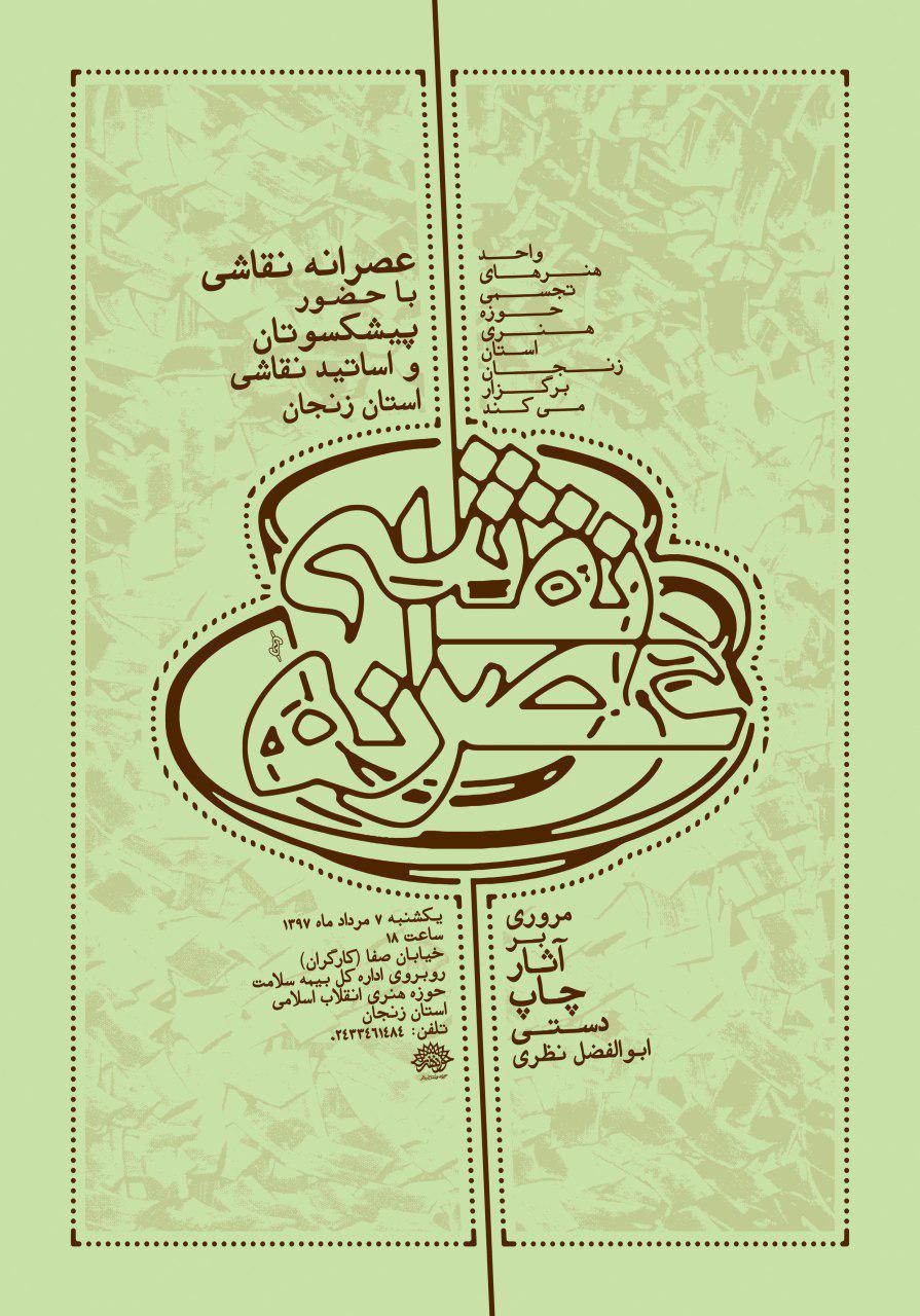 به گزارش روابط عمومی حوزه هنری زنجان؛ عصرانه نقاشی با محوریت مروری بر آثار چاپ دستی ابوالفضل نظری عصر روز یکشنبه 7 مردادماه 97 در حوزه هنری استان زنجان برگزار شد.