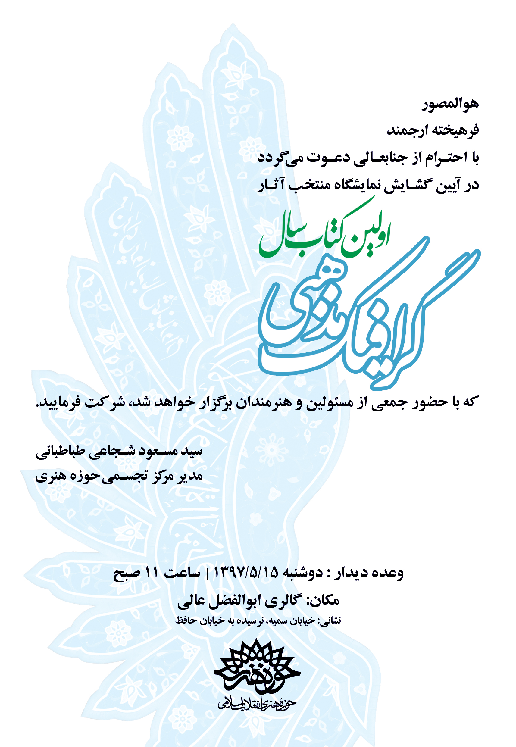 افتتاح نمایشگاه آثار منتخب و رونمایی از اولین کتاب سال گرافیک مذهبی با حضور هنرمندان صاحب اثر در این مجموعه، روز دوشنبه 15 مردادماه، ساعت 11 صبح، در گالری عالی حوزه هنری به نشانی خیابان سمیه، نرسیده به خیابان حافظ برگزار خواهدشد.