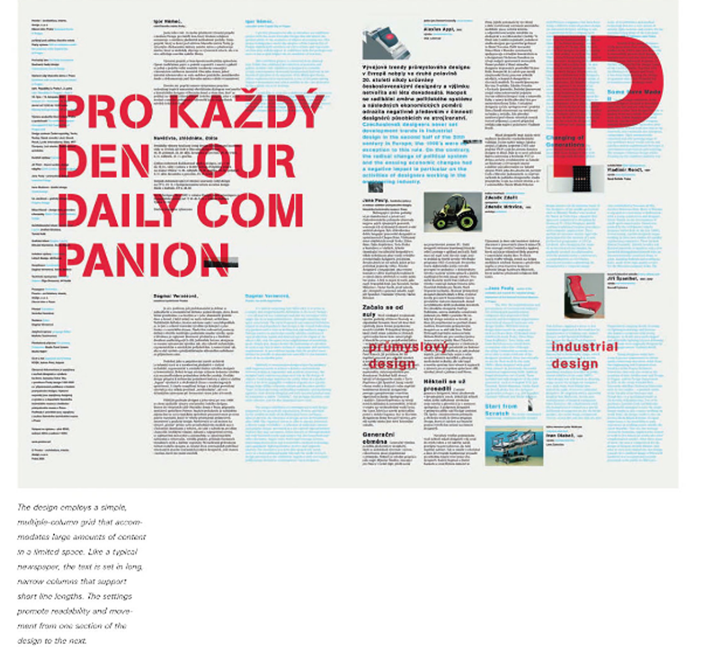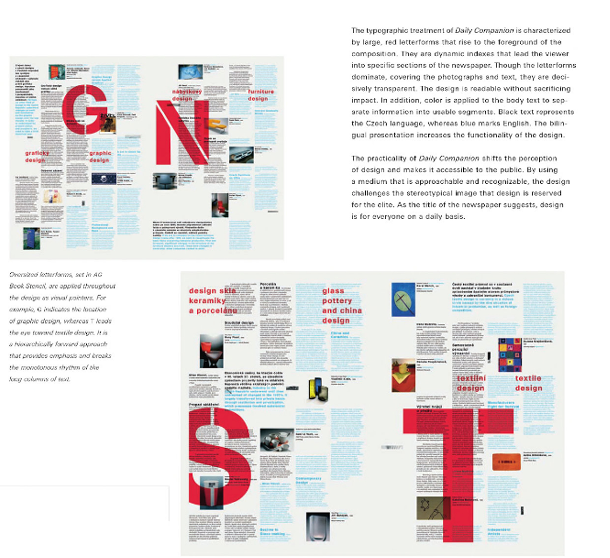 مطالب و تصاویر به گونه ای تقسیم شده که مخاطب خود را به راحتی هدایت می کند. ستون مشکی در این نشریه به زبان چک و متون آبی به زبان انگلیسی هستند. این طراحی برای یک نشریه ی دوزبانه ی نمایشگاهی بسیار جالب است.