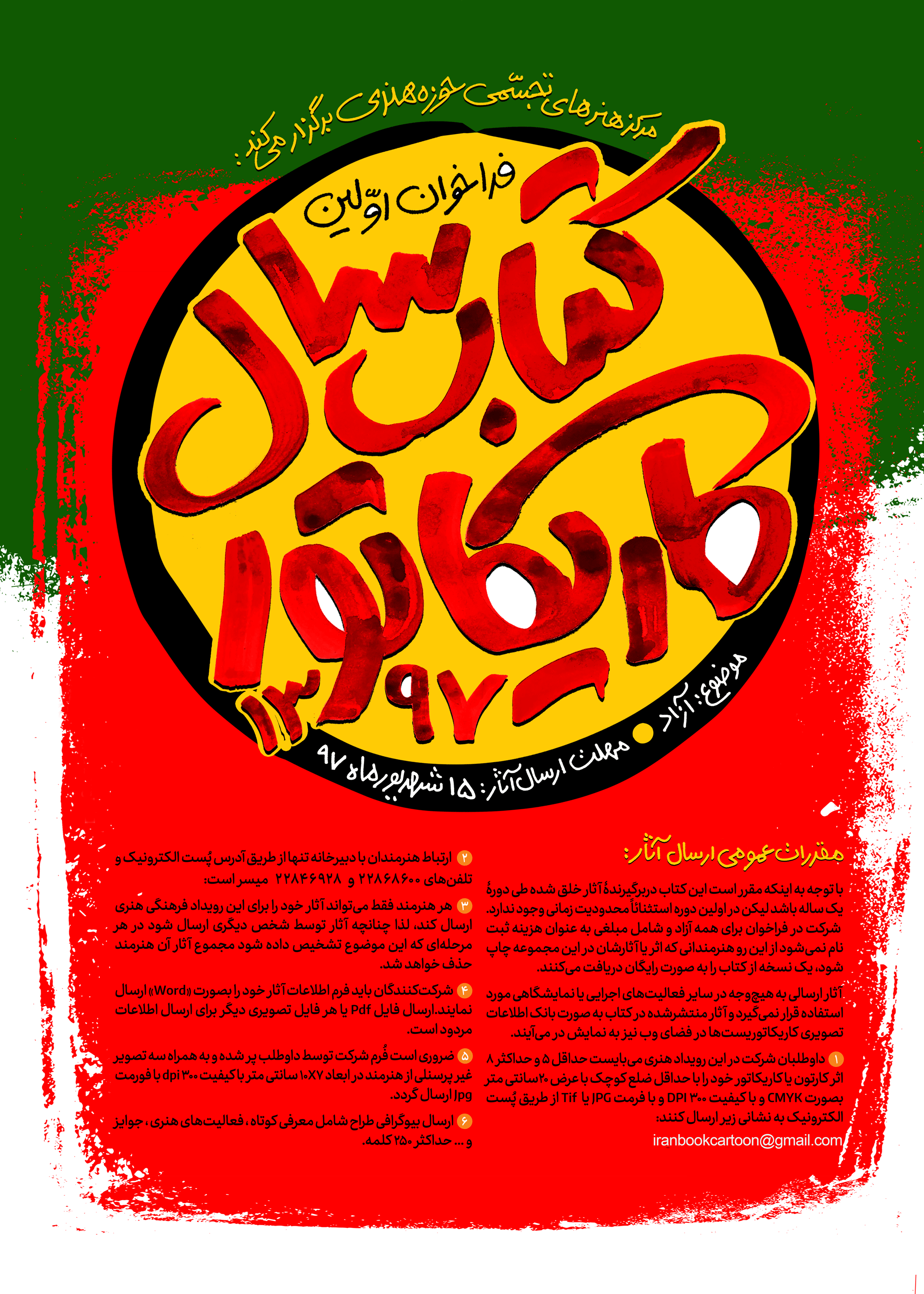 1.داوطلبان شرکت در این رویداد هنری می بایست حداقل" 5" و حداکثر "8" اثر کارتون یا کاریکاتور خود را با حداقل ضلع کوچک با عرض 20سانتی متر بصورت CMYK و با کیفیت 300 DPI و با فرمت JPG یا Tifاز طریق پُست الکترونیک به نشانی زیر ارسال کنند: iranbookcartoon@gmail.com