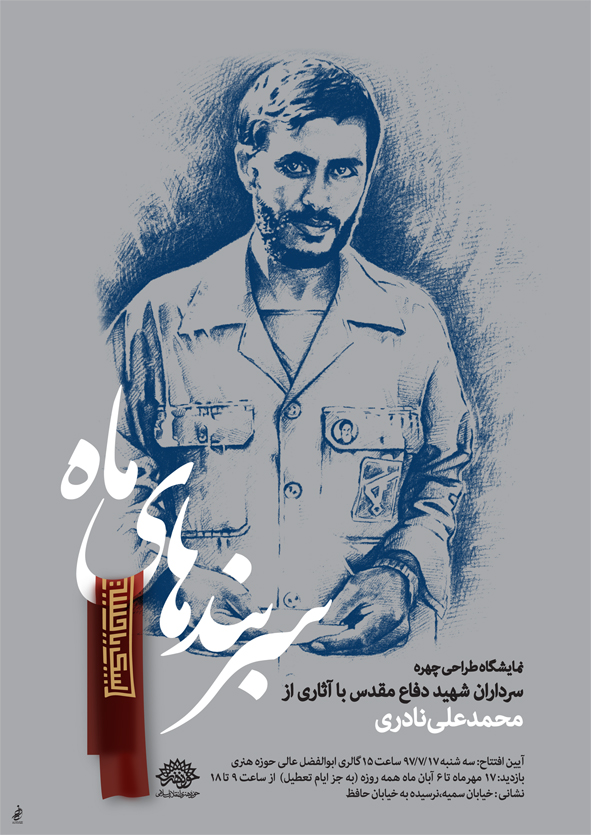 به گزارش روابط عمومی مرکز تجسمی حوزه هنری، روز سه شنبه 17 مهرماه، مراسم افتتاحیه نمایشگاه طراحی های محمدعلی نادری، هنرمند جوان بوشهری، از چهره جمعی از سرداران شهید دوران دفاع مقدس در گالری ابوالفضل عالی برگزار خواهدشد.
