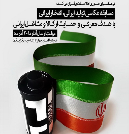 مسابقه عکاسی «تولید ایرانی، افتخار ایرانی» در سه محور مشاغل سنتی؛ نساجی، سفال، سرامیک و ...، مشاغل خانگی؛ تزیینات، دست بافته های خانگی و ... و مشاغل نو آورانه؛ مشاغلی که توسط خود شخص ابداع و اجرا شده، برگزار میشود.