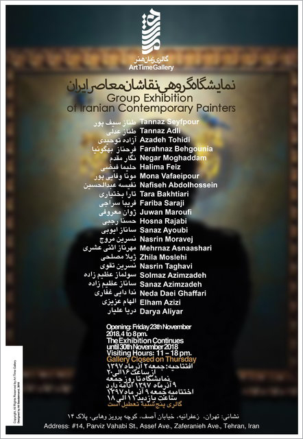 به گزارش روابط عمومی مرکز تجسمی حوزه هنری، نمایشگاه گروهی «نقاشان معاصر ایران» با آثاری از طناز سیف پور، طناز عدلی، آزاده توحیدی، فرحناز بهگونیا، نگار مقدم، حلیما فیضی، مونا وفایی پور، نفیسه عبدالحسین، تارا بختیاری، فریبا سراجی، ژوان معروفی، حسنا رجبی، ساناز ایوبی، نسرین مروج، مهرناز اثنی عشری، ژیلا مصلحی، نسرین تقوی، سولماز عظیم زاده، ساناز عظیم زاده، ندا دایی غفاری، الهام عزیزی و دریا علیار روز جمعه (۲ آذر ماه) در گالری آرت تایم افتتاح میشود.