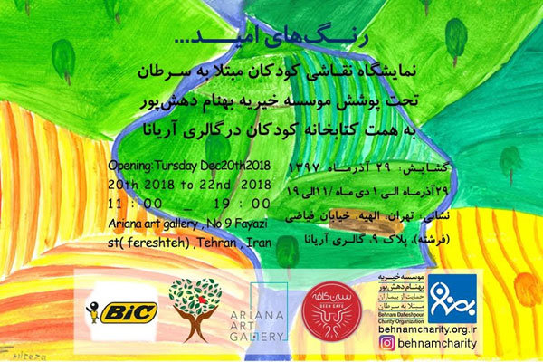 به گزارش روابط عمومی مرکز تجسمی حوزه هنری، نمایشگاهی از آثار خلق شده توسط کودکان مبتلا به سرطان و تحت حمایت موسسه خیریه بهنام دهشپور با نام «رنگ های امید» از ۲۹ آذر ماه در گالری آریانا برپا خواهد شد.