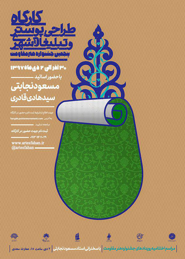 کارگاه طراحی پوستر و تبلیغات شهری یکی از بخش های جشنواره مقاومت است که با حضور استاد مسعودنجابتی و سیدهادی قادری و سایر اساتید مطرح رشته گرافیک و هنرهای تجسمی برگزار خواهد شد و در این کارگاه 30 نفر از هنرمندان گرافیست استان اصفهان در مدت سه روز زیرنظر این اساتید به یادگیری روشهای طراحی پوستر و تولید اثر خواهند پرداخت.