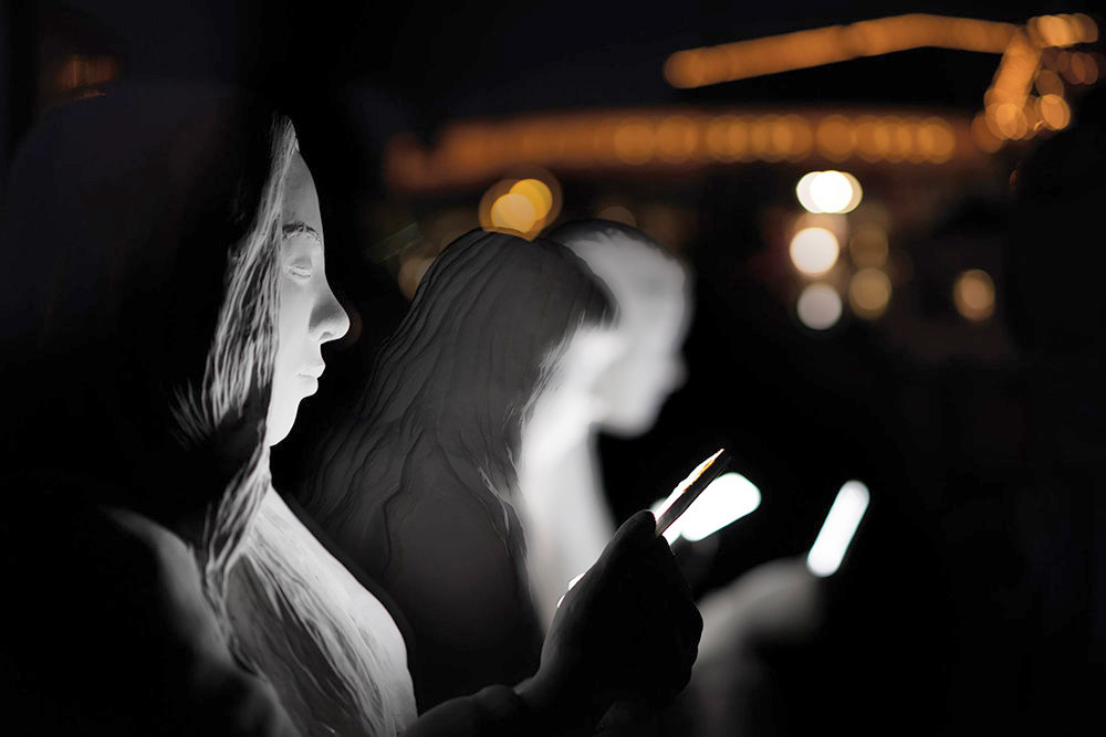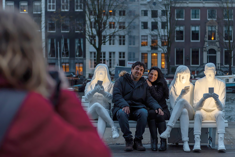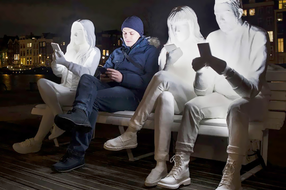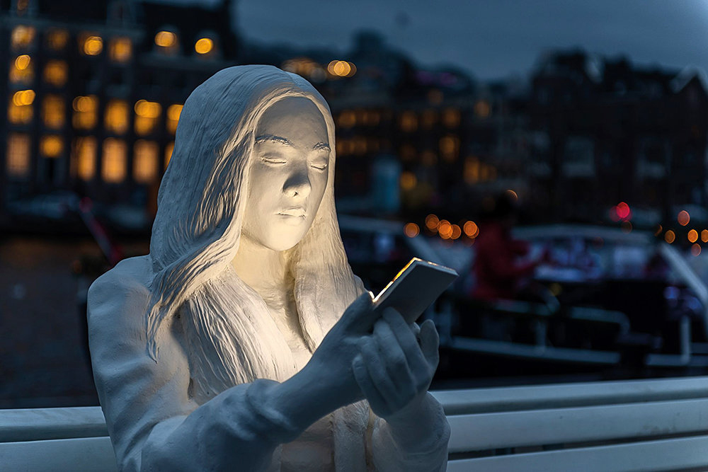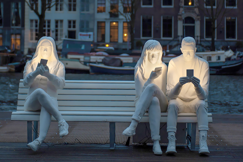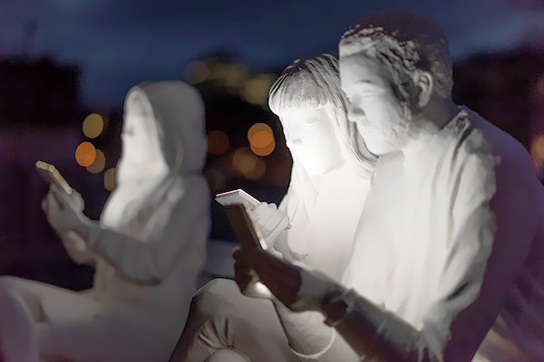 گری مکلوکاس هنرمند انگلیسی یکی از شرکتکنندگان امسال این مراسم است که با اثرش توجه زیادی را به خود جلب کرده است؛ مجسمههایی که در گوشیهای خود غرق شدهاند و بازتاب نور این گوشیها روی صورتهایشان عمق تنهایی و فاصله میان آنها را بیش از پیش نمایان می کند.