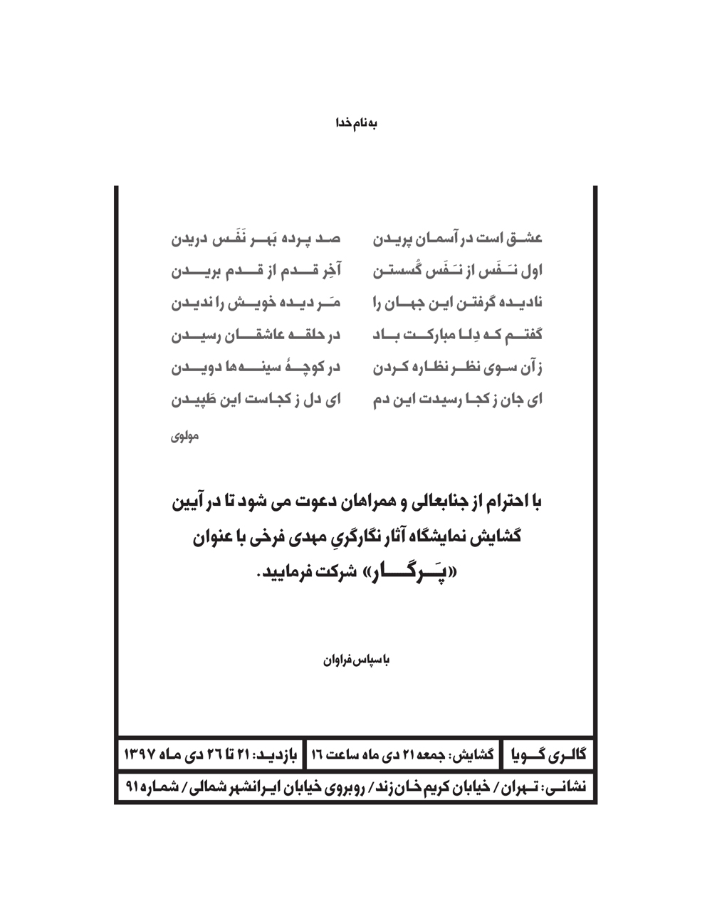 آیین گشایش نمایشگاه "پرگار" عصر جمعه، 21 دی ماه 1397، ساعت 16 در گالری گویا انجام می شود. علاقمندان می توانند از 21 تا 26 دی ماه از ساعت 9 الی 21 به گالری گویا به آدرس: تهران، خیابان کریمخان زند، روبروی خیابان ایرانشهر، پلاک 89 مراجعه نمایند.