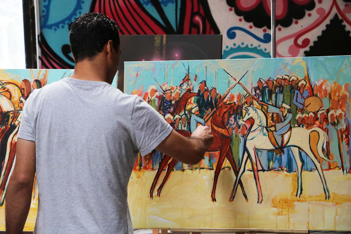 نقاشی های او یادآورِ گذشته و میراث مصری ها از گذشته تاکنون است، او به حفظ هویت مصر علاقه دارد. آثار او معمولا دارای چند داستان و لایه های متفاوت است. نقاشی دیواری های او بر دیوارهای خیابان محمد محمود، در قاهره معروف است.
