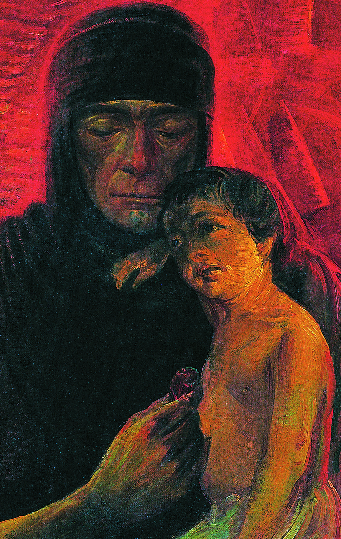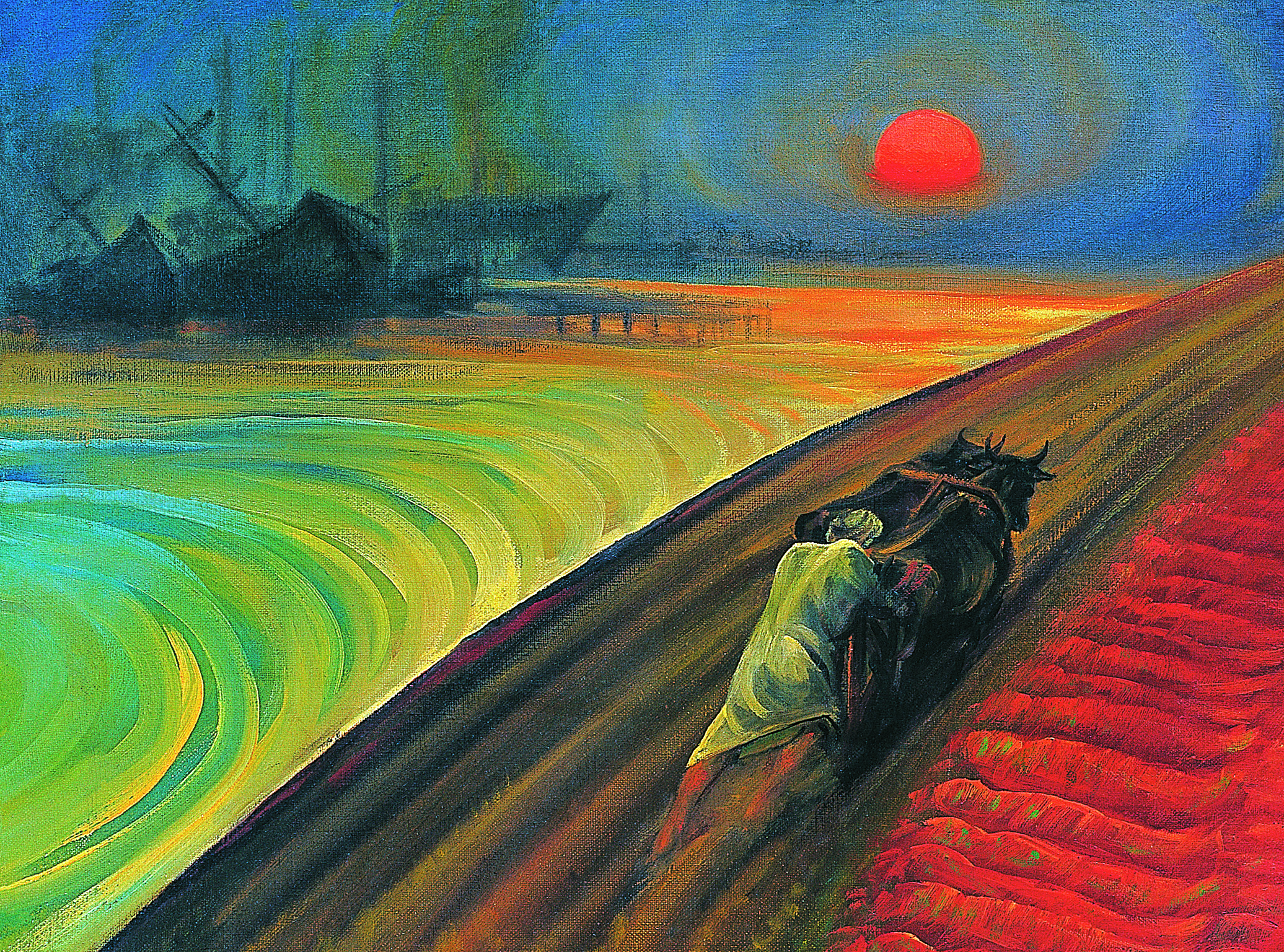 در مرکز تابلو، تصویر مادری دیده می شود که کودکش را در آغوش گرفته، دست چپ مادر غرق در خونِ همسر یا فرزندی است که برای دفاع از کشور به جبهه اعزام شده است. نیمرخ چهره ی مردان رزمنده رو به سوی نخلستانی است که طوفانی سهمگین آن را درنوردیده و پُر است از نخل های شکسته. این طوفان همان تجاوز نیروهای دشمن است. خون شهیدان در سمتِ راستِ تصویر از کنار دستِ مادر و زیر پاهای سربازان امتداد یافته و نخلستان را آبیاری می کند، در این مکان گل لاله ای روییده است. در سمتِ چپِ تابلو کشتزاری دیده می شود با گندم های طلایی و زیبا و مردی که با گاوآهن در حال حرکت است، این حرکت می تواند نمادی از زندگی و رویش و آبادانی در کشور باشد. در قسمت بالای اثر،سمتِ چپ دریایی می بینیم و کشتی هایی نیمه واژگون و خورشیدی که در حالِ غروب است...اما خون شهیدان ریشه های درخت انقلاب را آبیاری خواهد کرد و جوانه های تازه ای سر از خاک سرخ سر بر خواهند آورد.