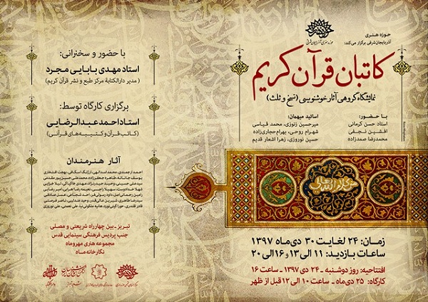 گفتنی است، نمایشگاه گروهی آثار خوشنویسی نسخ و ثلث «کاتبان قرآن کریم» با حضور اساتیدی چون استاد «حسن کرمانی»، «افشین نجفی»، «محمدرضا صمدزاده»، «میرحسین زنوزی»، «محمد قیاسی»، «شهرام روحی»، «بهرام حجاری زاده»، «حسین نوروزی»، «زهرا شعار قدیم» و سایر علاقهمندان از ۲۴ تا ۳۰ دیماه، صبحها از ساعت ۱۱ الی ۱۳ و عصرها از ساعت ۱۶ الی ۲۰ در گالری مهر و ماه در معرض دید علاقهمندان قرار گرفته است.