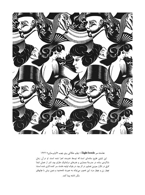 در این کتاب به موضوعات ذیل اشاره شده است : چاپ های اولیه، تقسیمبندی با قاعده صفحه، فضاهای نامحدود، تصاویر آینهای، واژگونی، اجسام چندوجهی، نسبتها، تضاد میان سطح صاف و مارپیچی، ساختمانهای غیرممکن.
