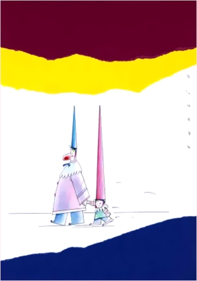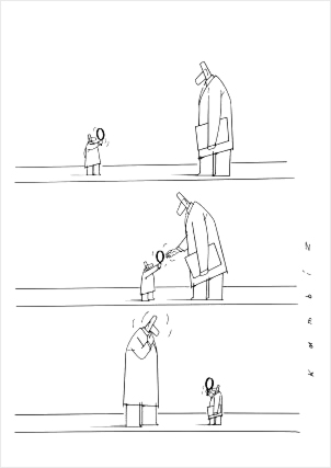 در یکی از کارها مردی بلند قد را در برابر فردی کوتاه قد که ذره‌بین به دست دارد، می‌بینیم. زمانی که مرد بلند قد قصد نزدیک شدن به فرد ذره‌بین به دست را دارد، مرد کوتاه قد فاصله می‌گیرد و همچنان با ذره‌بین به او نگاه می‌کند. در واقع این فرد قصد دارد با زوم کردن بر روی مرد بلند قد از او عیب‌جویی کند و ایراداتی را در او پیدا کند. این اثر به قضاوت بی چون و چرای ما نسبت به یکدیگر اشاره دارد.