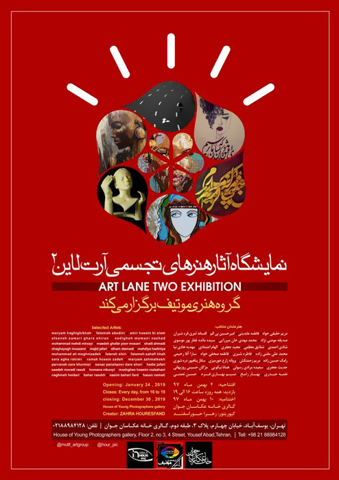نمایشگاه گروهی «آرت لاین ۲» شامل آثار هنرمندانی همچون؛ شادی احمدی، الهام اعتمادی، سارا آقارحیمی، نسیم بهاری، امیرحسین بیالم، ساناز پناهپور درهشوری، افسانه ثمری، حدیث جعفری، مجید جعفری، رامک حسینزاده، مژگان حسینیروزبهانی، مریم حقیقیخواه، نغمه حیدری، محمد مهدی خانمیرزایی است.