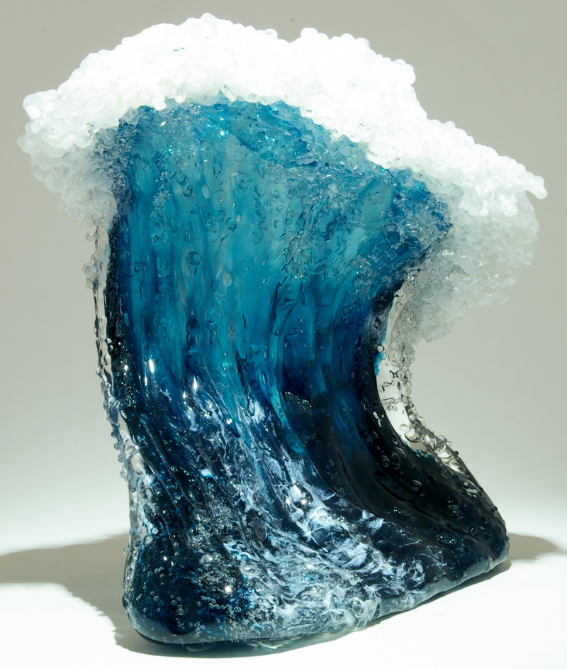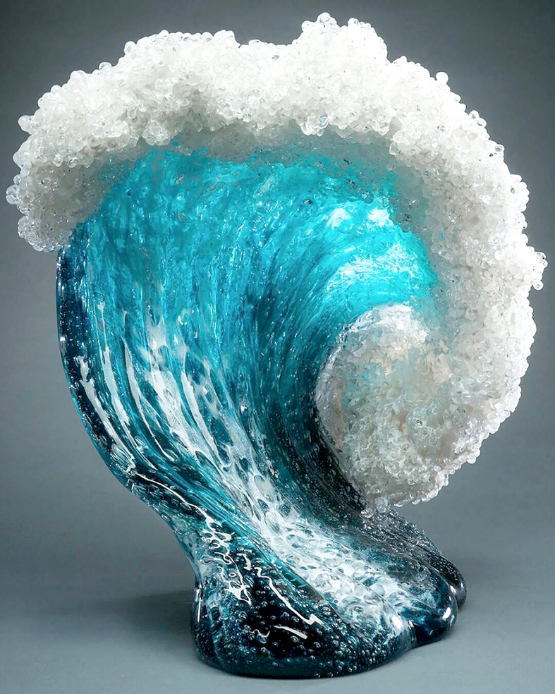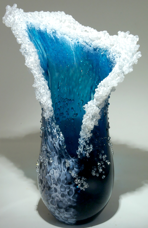 این دو هنرمند با استفاده از حبابهای داخل شیشه و جزئیات سفید فوم حالت یک موج در حال سقوط در دریا را در یک مجسمه به مثابه گلدان ایجاد کردهاند.