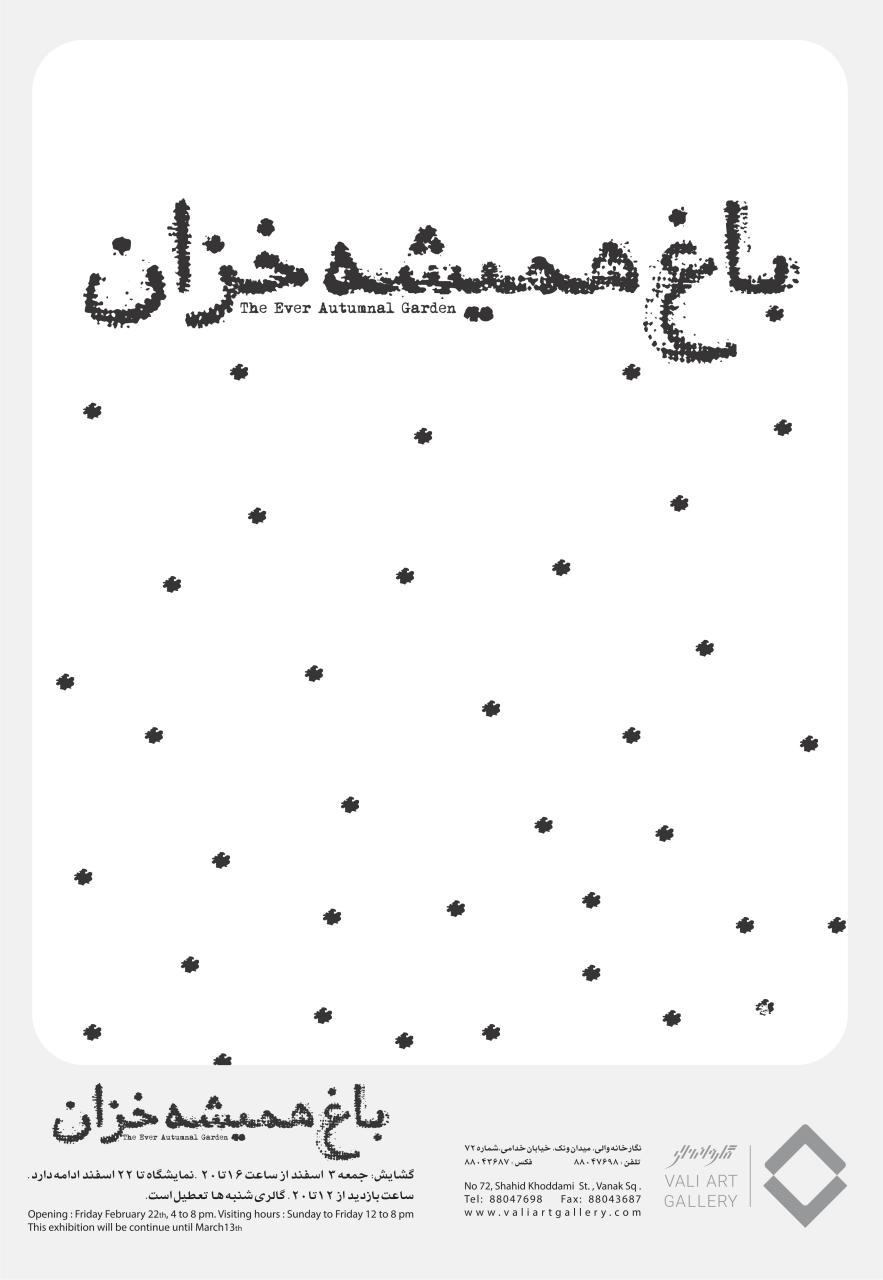 نمایشگاه «باغ همیشه خزان» تا ۲۲ اسفندماه در گالری والی به نشانی میدان ونک خیابان خدامی شماره ۷۲ ادامه خواهدداشت.