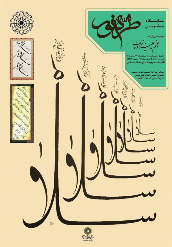 این نمایشگاه مشتمل بر 22 تابلو و دو مرقع به خط نسخ ایرانی است که با مضامین قرآنی و ادعیه در ترکیباتی غالبا بدیع، از روز 8 اسفند 97 برپا شده است.