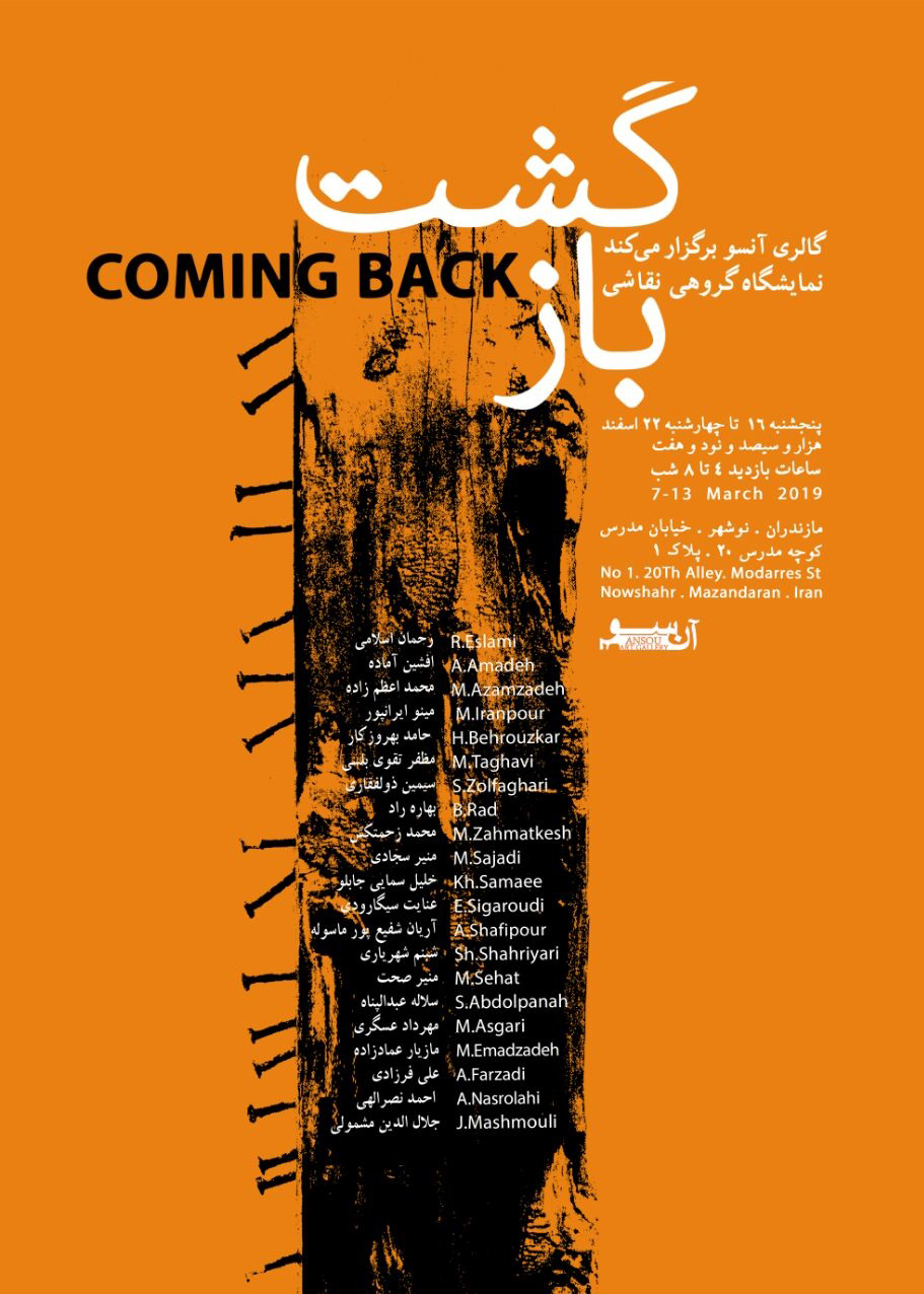 نمایشگاه «بازگشت» از روز پنجشنبه ۱۶ اسفند تا چهارشنبه ۲۲ اسفند در گالری «آنسو» به نشانی نوشهر، بلوار امام رضا(ع)، خیابان مدرس، مدرس بیستم، پلاک یک پذیرای علاقهمندان خواهد بود.