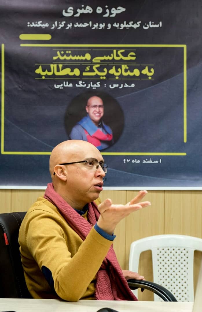 علایی از حوزه هنری کهگیلویه و بویراحمد به خاطر برگزاری این دوره آموزشی و همچنین استقبال چشمگیر شرکتکنندگان تقدیر کرد و گفت: در این کارگاه آموزشی مباحثی شامل تعریف عکاسی مستند، شکلگیری جریان مستند در عکاسی، جریان سینما و ترفندهایی که در حوزه سینما منجر به فیلم مستند میشود، ارتباط سینما و عکاسی و چرخش عکاسی مستند بعد از دهه ۹۰ صحبت شد و ۱۹۵ کپشن از مجموعههای داخلی و خارجی که این جریان را دنبال میکردند برای شرکتکنندگان نمایش دادیم تا تصویر واضحتری از عکاسی مستند داشته باشند.